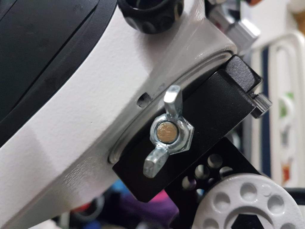 The Sky Watcher Star Adventurer wedge however needs a small adjustment. The screw for the Vixen style mounting bracket on the Staradventurer wedge needs to be replaced, because its handle is too wide and blocks the rotation of the mount. As the screw has a standard M8 thread, you can simply use a n inexpensive M8 screw for this purpose. To eneble me to lock the screw tightly without any tools I found the following solution: By sawing off the head of an M8 screw and replacing it with a winged nut, countered with a regular nut, I get a nice handle that does not block the rotation of the mount.
