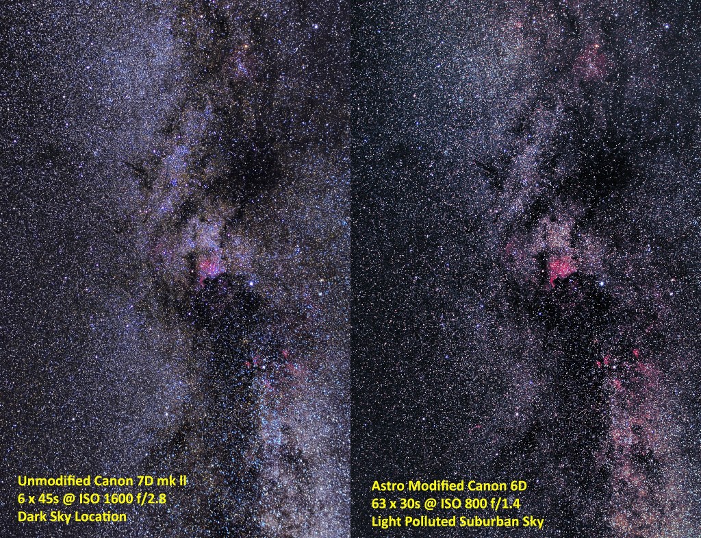 – The right side was captured with my astro-modified camera from my suburban backyard. The much longer (combined) exposure time and wider aperture means I captured 28-times more light here. Together with the lower ISO and the full frame chip, this made the resulting stacked image much less noisy, allowing me to stretch the image quite extremely during post processing. While the red nebulas stand out a bit better, the subtle blue hues were simply swamped by the polluted sky, and due to the exaggerated red sensitivity of the camera, the stars do not appear as colorful.