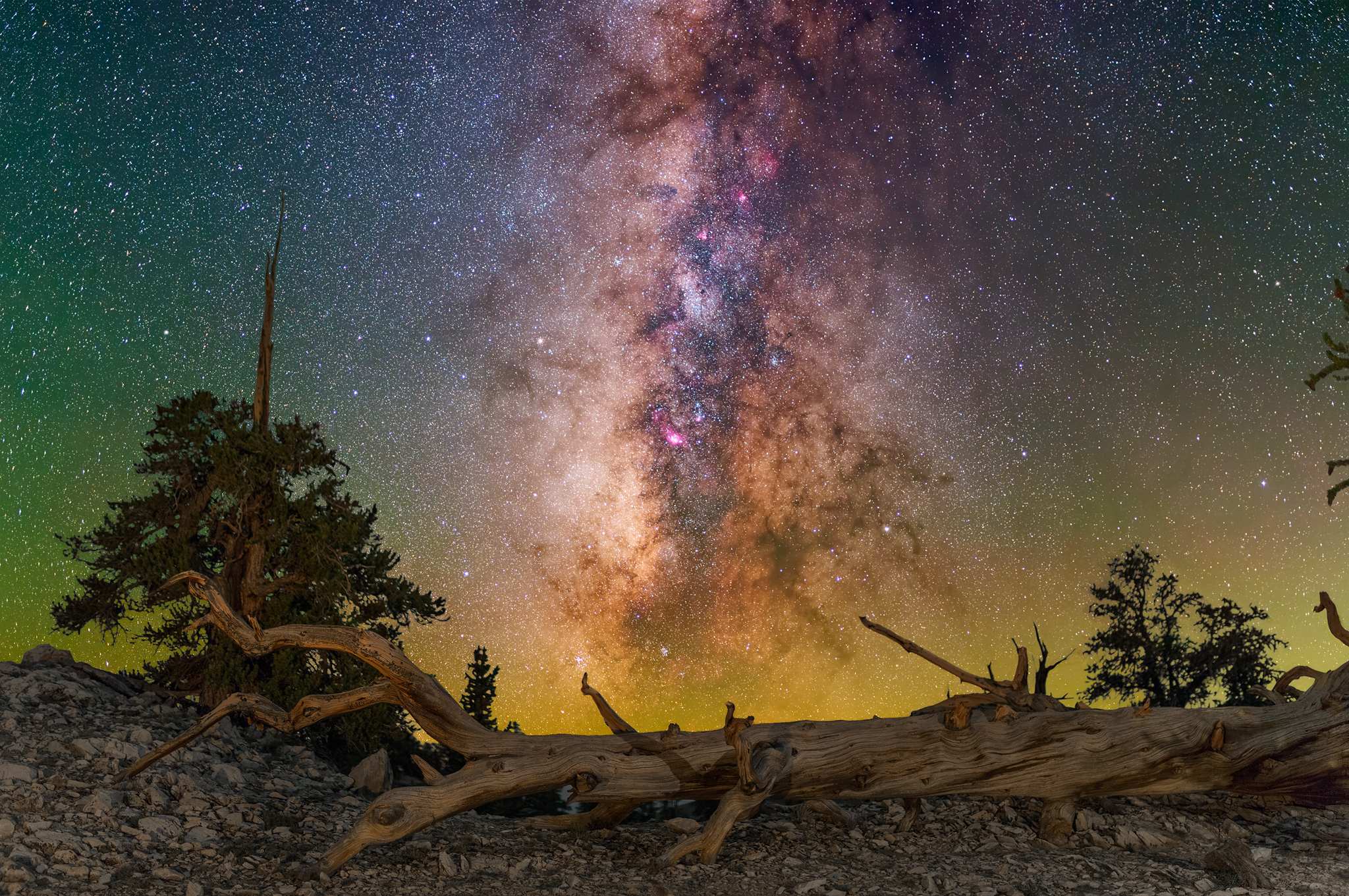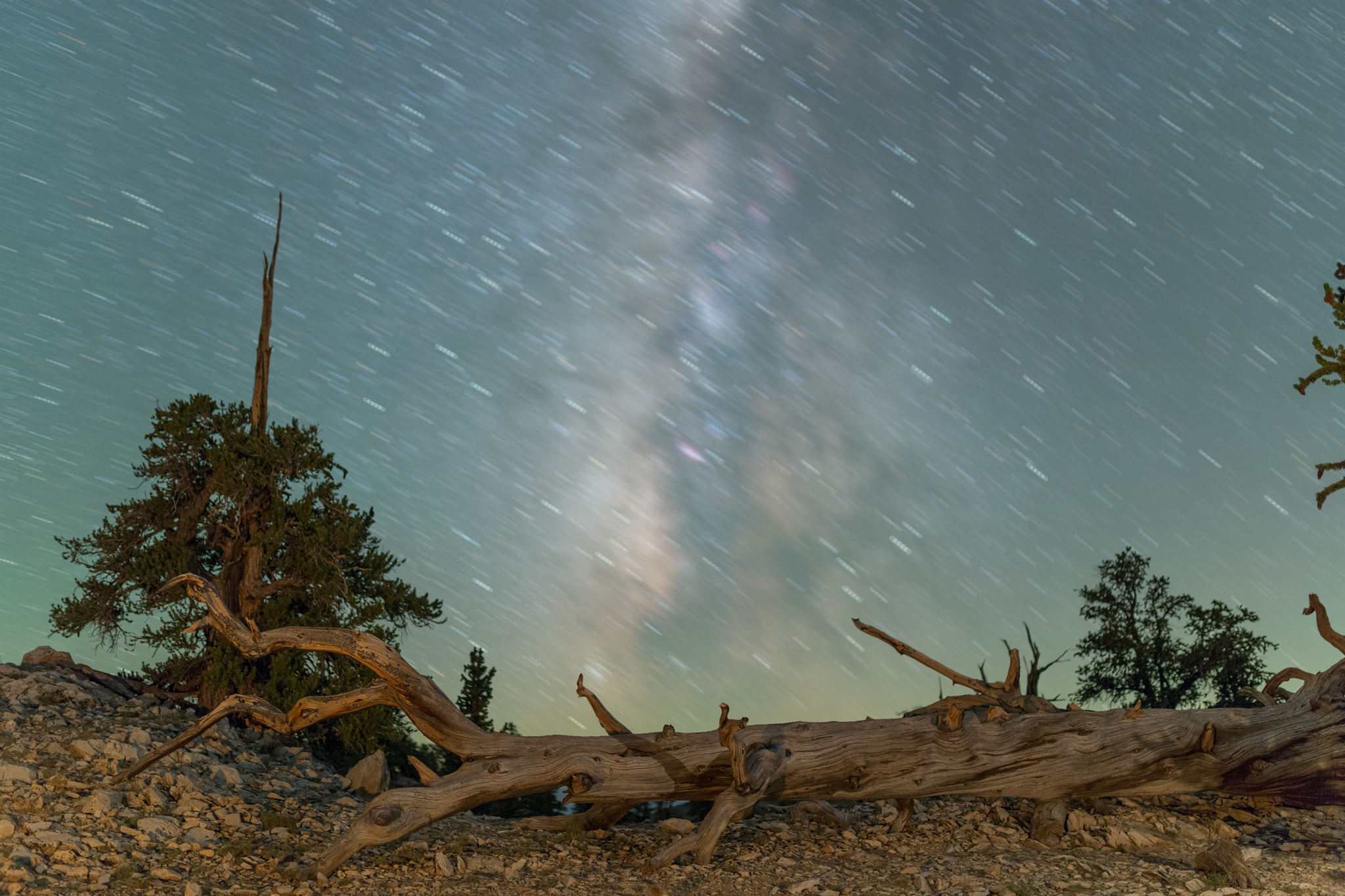 In this article, I use an image from Ancient Bristlecone National Monument in Eastern California, captured in 2017. This is a bortle class 2 zone with only minimal light pollution coming from the town of Bishop in the West. The glow is very faintly visible on the lower right side of the image.